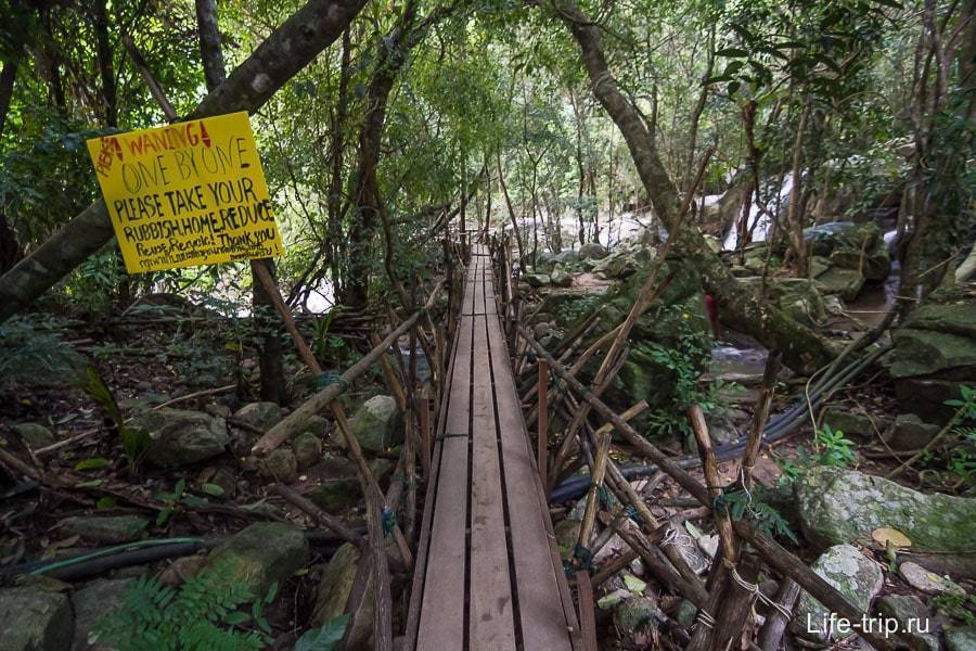 Шли мы по тропе, ожидая водопада, но встретились с иностранцами, которые сообщили, что проход заблокирован упавшим деревом и придется обходить по каменистому руслу. При первой же возможности, мы свернули влево с тропы и пошли по камням. Это произошло возле такой таблички: