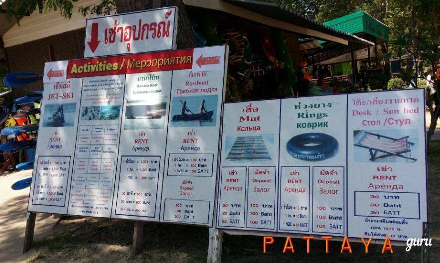 На пляже доступна аренда шезлонгов, лежаков и зонтиков, прокат водного транспорта. В середине побережья находятся развлечения – катание на банане и каяке. Стоимость услуг составляет, в батах: