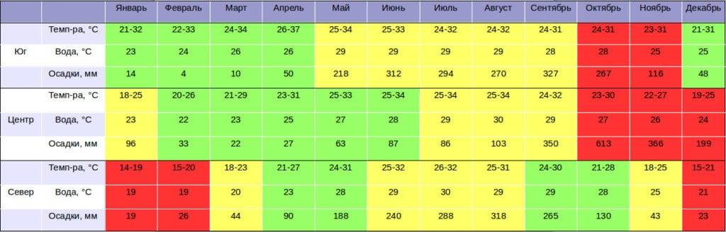 | центр | днем +23..+25 ночью +20 море +23..+24 ветра, волны, регулярные осадки | днем +27..+32 ночью +24 море +23..+27 регулярные дожди | днем +32..+34 ночью +25 море +29 сезон тайфунов и непогоды в августе | днем +30 ночью +22..+24 море +26..+28 пик дождливого сезона, ураганы, наводнения |