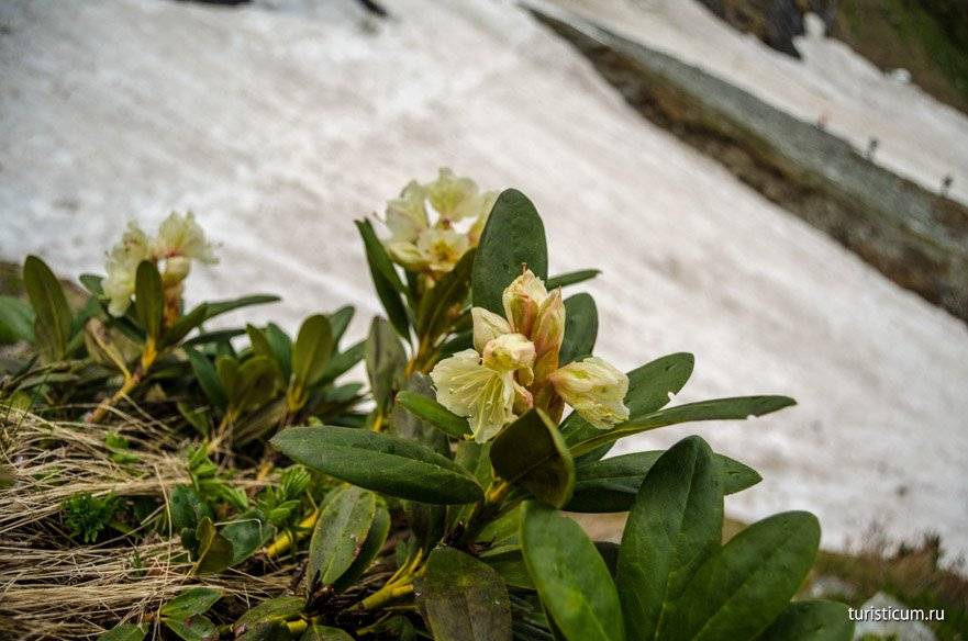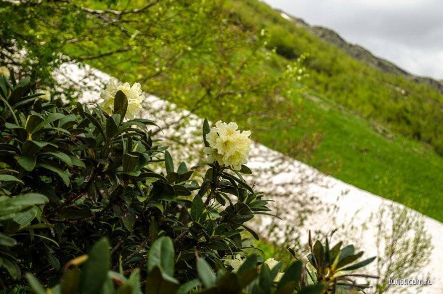 На горных склонах не редко, и чем выше тем чаще, можно встретить красивый цветок Рододендрон горный или кавказских. Это морозостойкое растение очень полезно для здоровья, в поселке с его листьями можно купить горный чай.