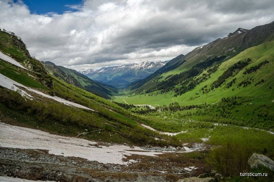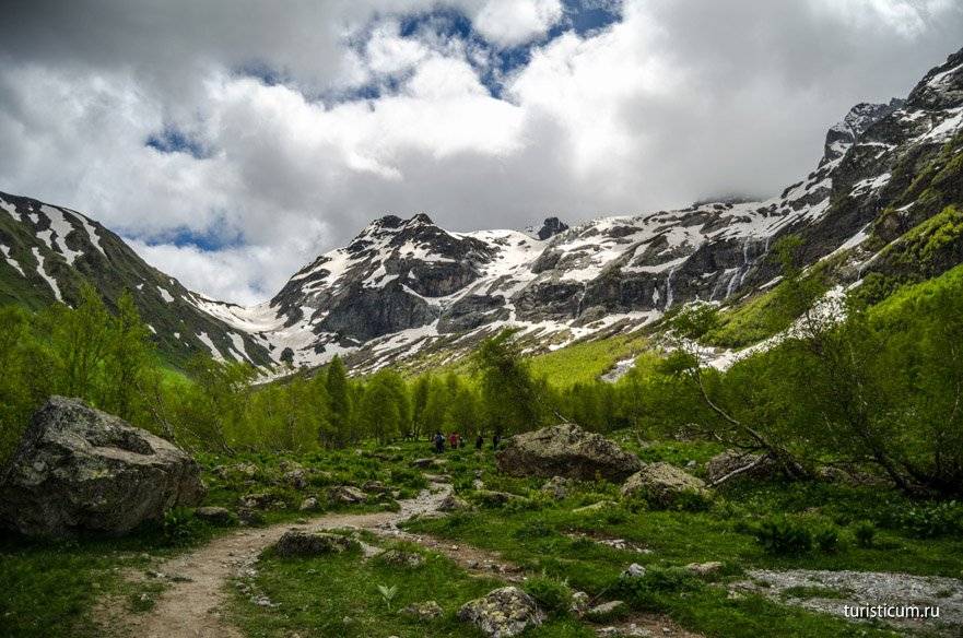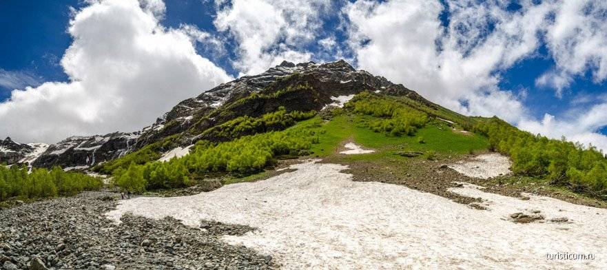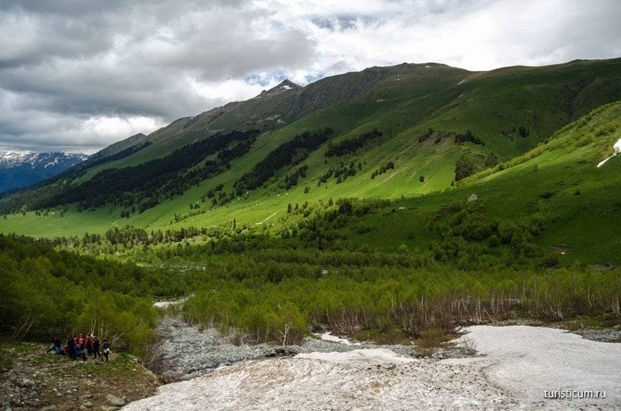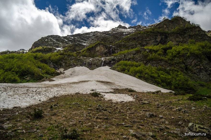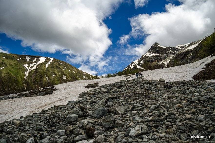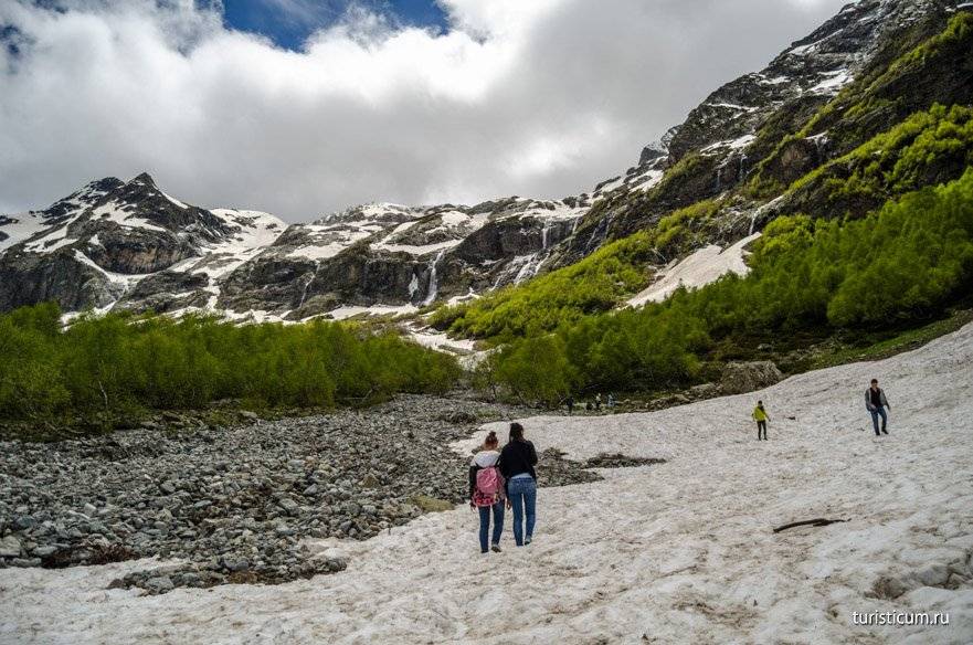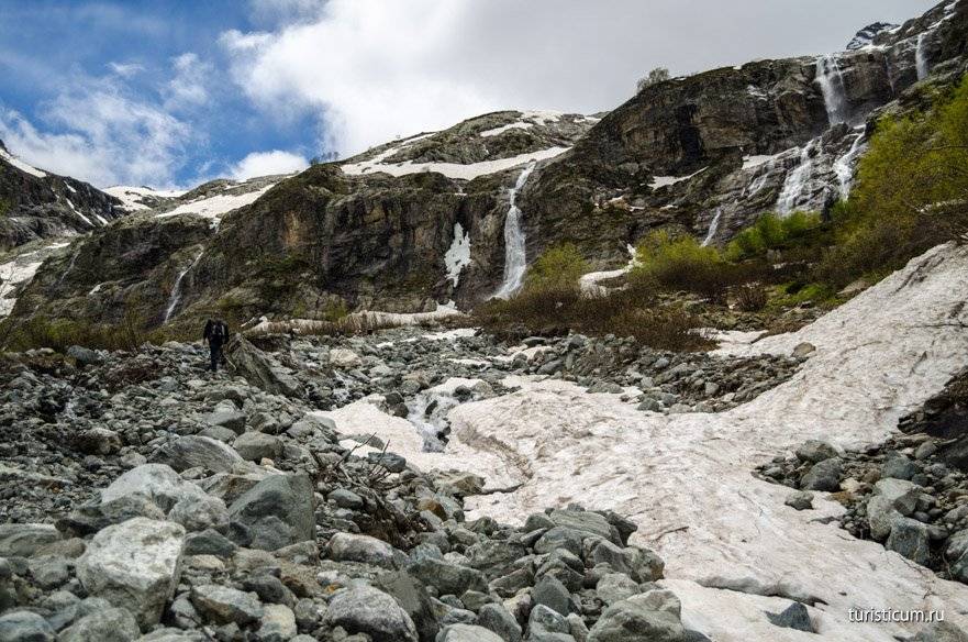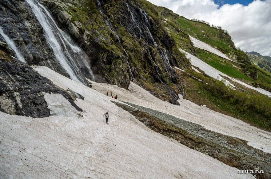 Второй километр вместе с подъемом приносит и трудности. Даже в середине июня, а именно тогда мы посетили Архыз, на склонах Софии еще лежит снег. Сами водопады открываются только в конце мая. Ледяная вода и снег сказываются на температуре воздуха, которая начинает понижаться. Чем выше мы забираемся, тем ниже температура. В среднем перепад температур на Софийских водопадах и на Ледниковой ферме составляет 5-7 градусов. Кроме того, местами придется идти по снегу, а в какой-то момент придется форсировать реку, хорошо если поток будет не сильным и можно будет переправиться по камням. Отсюда несколько советов относительно одежды. Одевайтесь сообразно. Это горы, берите с собой ветровку, одевайте кроссовки или ботинки, не одевайте тапочки и сланцы. Не забудьте крем от загара, в горах солнце безжалостно. Комфортная обувь поможет вам безопасно преодолеть снежники и уберегут вас от острых камней.
