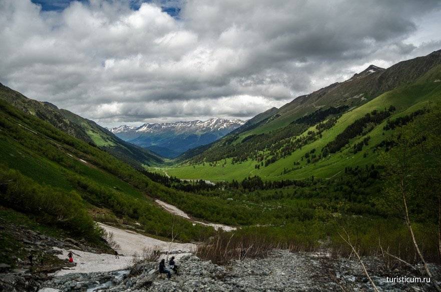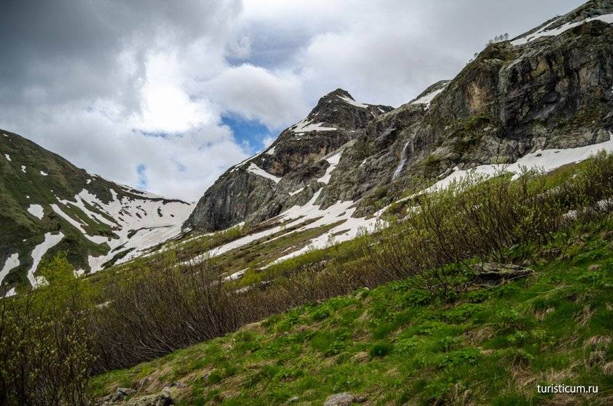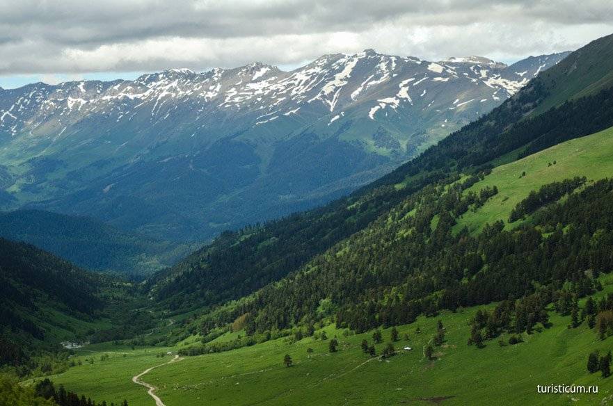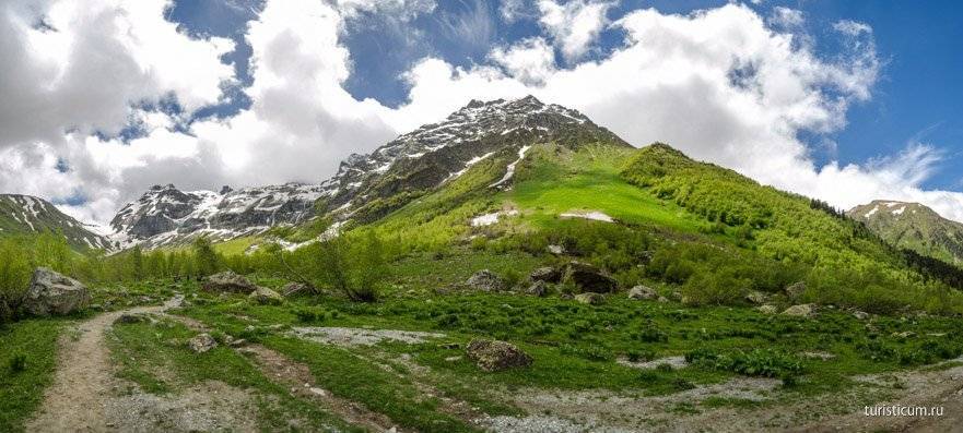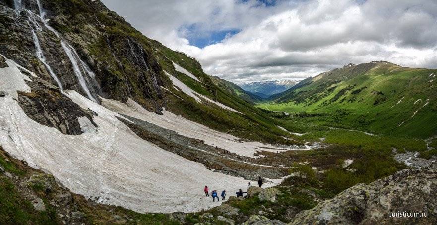 От подножия Софийских водопадов открывается завораживающий своей красотой вид на хребет Абишира Ахуба. А седловина на хребте это перевал Федосеева, за которым расположены горные озера, тоже любимый туристами маршрут, а теперь еще и упрощенный, за счет появления канатной дороги на горнолыжном курорте Романтик.