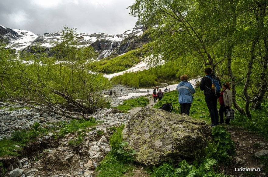 Вся прогулка от места стоянки до Софийских водопадов займёт примерно 2 часа на подъем и 1 час на спуск, поэтому заложив временной интервал в 4 часа вы успеете и забраться к водопадам и полюбоваться ими и спуститься обратно. В стоимость экскурсии входит и обратный трансфер, поэтому не бойтесь остаться без транспорта, все экскурсоводы хоть и не идут с вами к водопадам, дожидаются вас внизу. Здесь же в кафе можно попробовать национальную карачаевскую кухню. Суп шорпа — бульон с бараниной и картошкой, шашлык из барашка, хычины с мясом или сыром и вкуснейший горный чай.