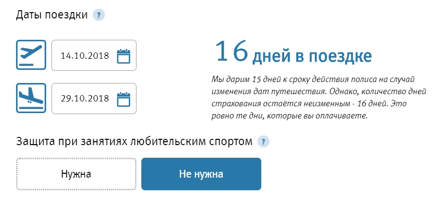 После останется продублировать даты поездки и указать, планируете вы заниматься во время отпуска активными видами спорта или нет. Если данный риск не включить в договор и выяснится, что страховой случай произошел по его вине, то страховщик откажет в выплате.