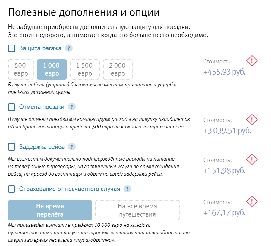 Существенные изменения в окончательной сумме могут проявиться при выборе дополнительных опций. Так, к примеру, защита багажа оценочной стоимостью в тысячу евро потребует доплаты приблизительно в 425 рубля, а случай отмены поездки – в 1420 рублей. Чтобы получить юридическое содействие в поездке, придется накинуть еще до 2500 рублей.