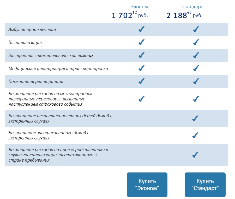 - «Эконом» включает медицинские услуги, транспортировку до медицинского учреждения, и в случае смерти застрахованного лица – репатриацию на родину.