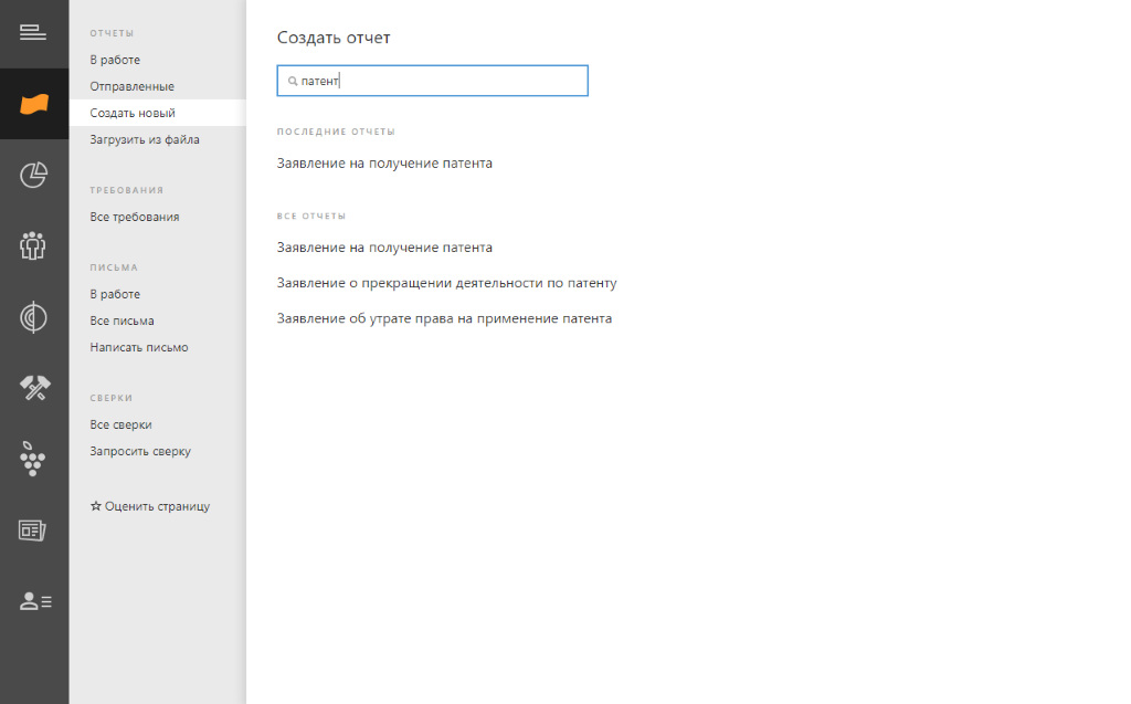 Чтобы подать заявление, перейдите во вкладку ФНС и в разделе «Отчёты» и выберите «Создать новый». Найдите заявление на получение патента через поиск.