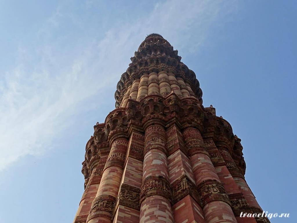 Как нам сказал гид: «Первый ярус Кутб-Минар построил в конце XII века князь Чаухан для своей дочери, чтобы та с высоты любовалась прекрасными видами берегов чудесной реки Ямуны. Но уже через несколько лет мусульманский властелин Айбек изменил внешний вид башни. Башня тогда и получила название, дошедшее через века до нас — Кутб Минар. Затем уже его потомки достраивали Кутб-Минар. В 1370 году император Туглак наконец-то закончил строительство, завершив последние IV и V ярус, тем и прославился в истории. И вот перед нами это величественное сооружение — башня Кутб-Минар, дошедшая до наших времен. Представьте себе высоту двух 9 этажных домов, поставленных друг на друга. Так вот, его высота составляет 72,6 метра, диаметр основания 14 метров, а диаметр вершины около 3 метров.