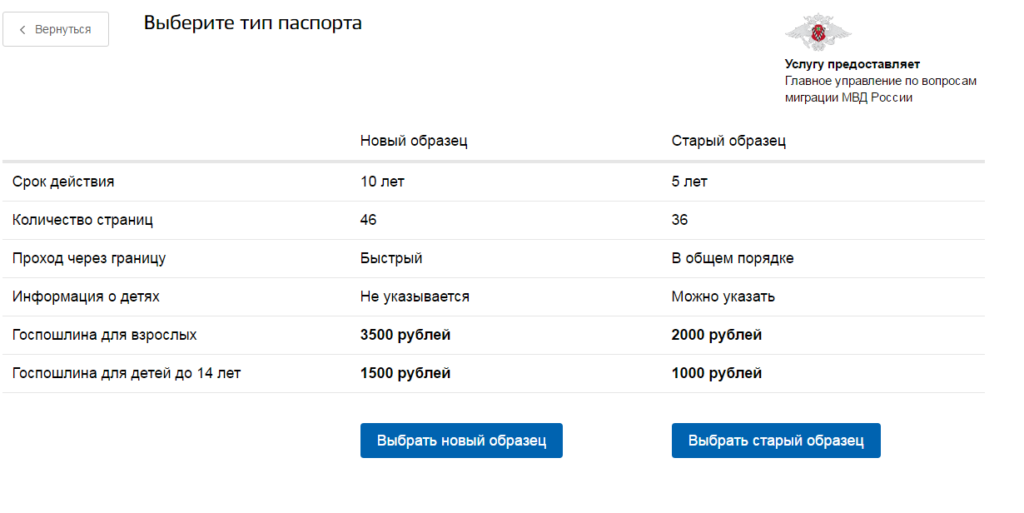 Если Вам нужен биометрический загранпаспорт, то следует нажать на кнопку «Выбрать новый образец», если паспорт старого типа — соответственно «Выбрать старый образец».
