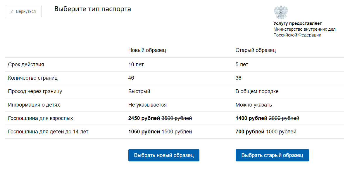 Выбираете тип паспорта, который хотите. Это может быть уже новый вид или старый образец. У каждого есть достоинства и недостачи. Новый загранпаспорт, несмотря на то что стоит дороже, обладает большим количеством преимуществ. Со всей информацией можно ознакомится при выборе типа паспорта. Цена на старый образец меньше, в него возможно внести детей, чего не разрешается сделать в новом паспорте.