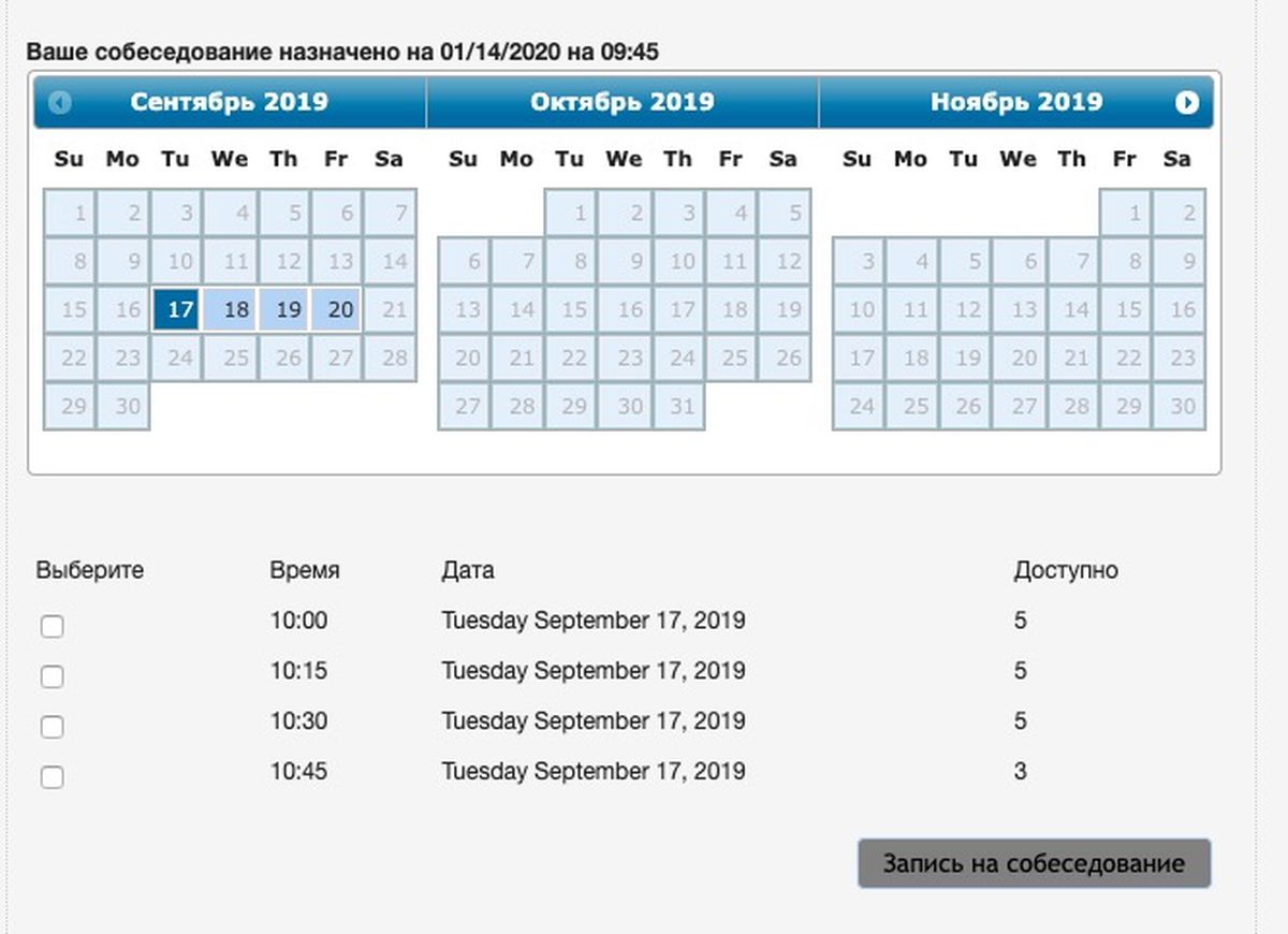 После заполнения анкеты и оплаты всех сборов нужно выбрать подходящую дату для собеседования в личном кабинете на сайте консульства.