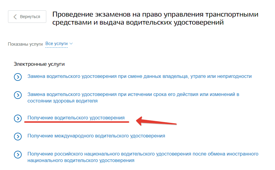 Если вы уже зарегистрированы и имеете подтвержденную учетную запись, то после авторизации на портале вам будет предоставлен список всех доступных услуг, среди которых “Получение права на управление транспортным средством”. Выберите её.
