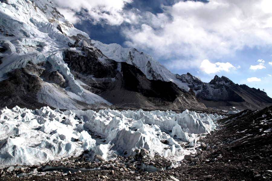 Ледник Кхумбу. Массив Джомолунгмы – один из самых крупных центров горного оледенения в Непале. Здесь находится более 350 ледников разнообразных типов – от небольших каровых и висячих до крупных котловинных и долинных, расположенных в глубоких ущельях. Концы крупных ледников опускаются на южных склонах до отметок 4500 – 4700 м. Наиболее известный и чаще других посещаемый ледник в пределах национального парка Сагарматха – Кхумбу. Его главный исток берет начало на западном склоне пика Джомолунгмы. Ледник образует гигантский ледопад высотой 700 – 750 м. Фактически это ледяной лабиринт с трещинами и расщелинами, расходящимися в разных направлениях. Все альпинистские маршруты на Джомолунгму с юга и юго-запада начинаются с ледопада Кхумбу.