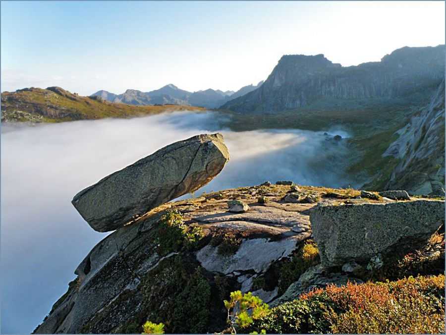 Висячий камень (1750 м) – еще один символ Ергаков, самый знаменитый из всех висячих камней заповедника. К камню ведут несколько троп, самая популярная проходит мимо озера Радужное.