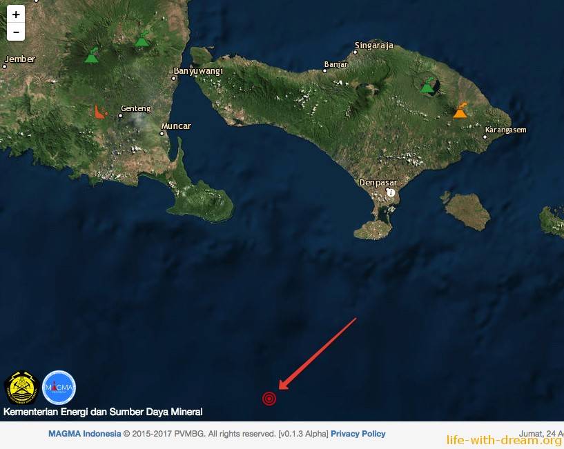 Смотрите на карту выше. Звездой обозначен эпицентр землетрясения. Кольцами расходятся волны содрогания земли. Половину Бали захлестывает волна 4-5 баллов по шкале Рихтера. Скажу вам – это немало. Многие люди, в том числе и местные жители, выходят из помещений на улицу для безопасности.