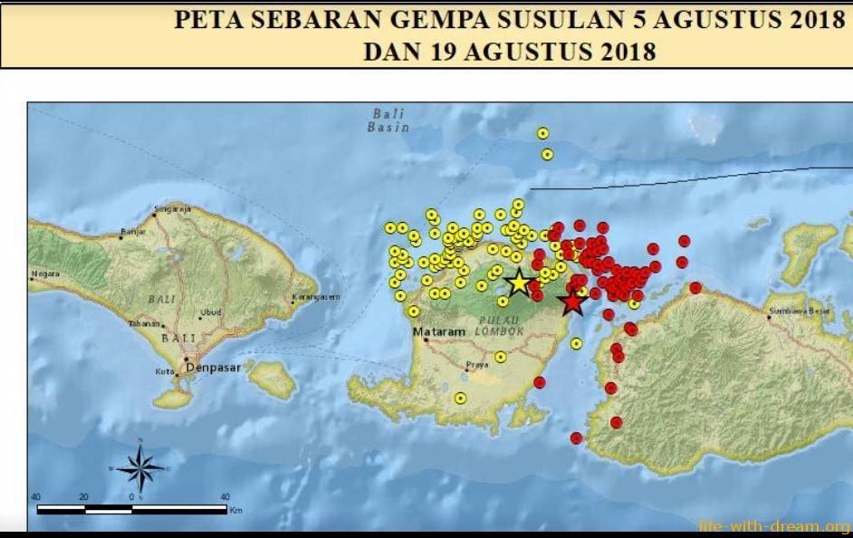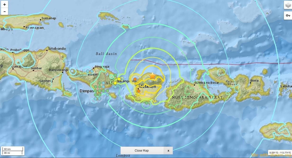 5 августа в 19:46 по местному времени на острове Ломбок (см. на карте справа) случилось землетрясение, с эпицентром на глубине 15 километров, на севере острова в 7.0 баллов по шкале Рихтера. Далее последовали афтершоки и возникновение еще трех эпицентров с силой толчков 5.0 баллов по шкале Рихтера (см. карту выше).