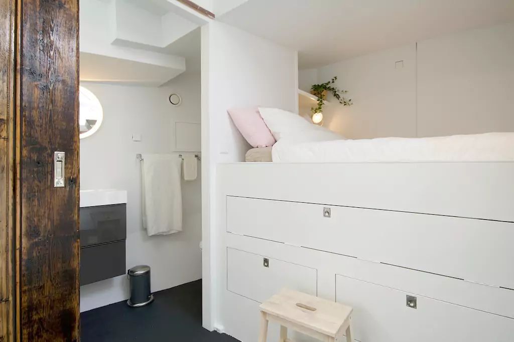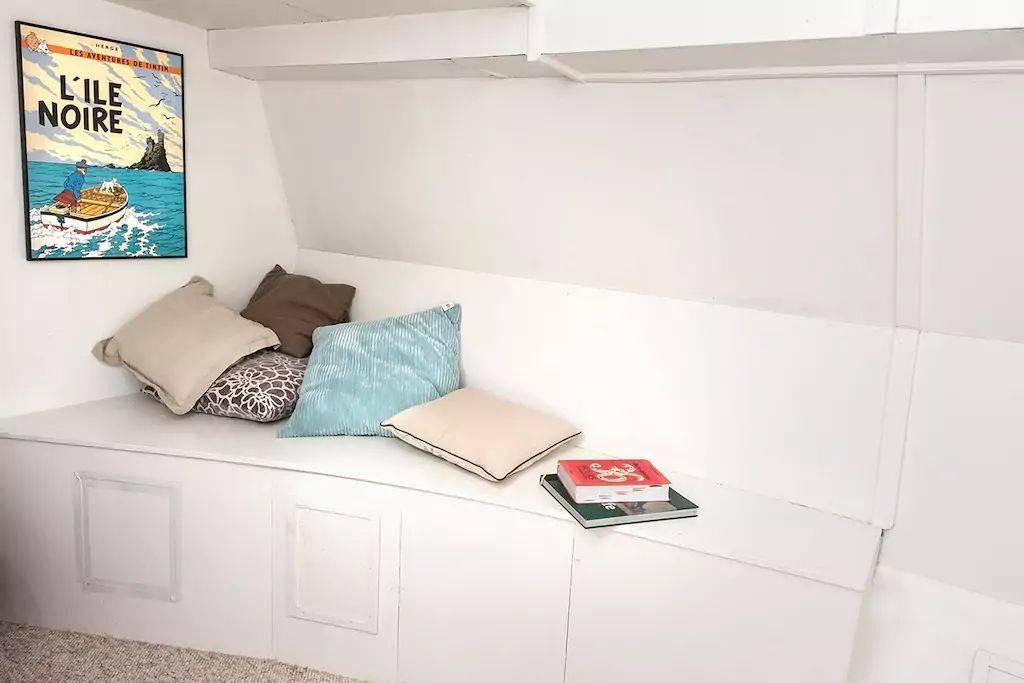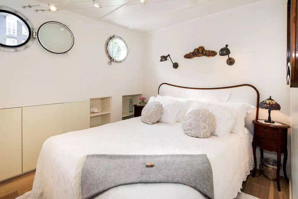 В спальне очень уютно: на белоснежных стенах разместились миниатюрные окна-иллюминаторы, а на возвышенности расположилась мягкая двуспальная кровать.