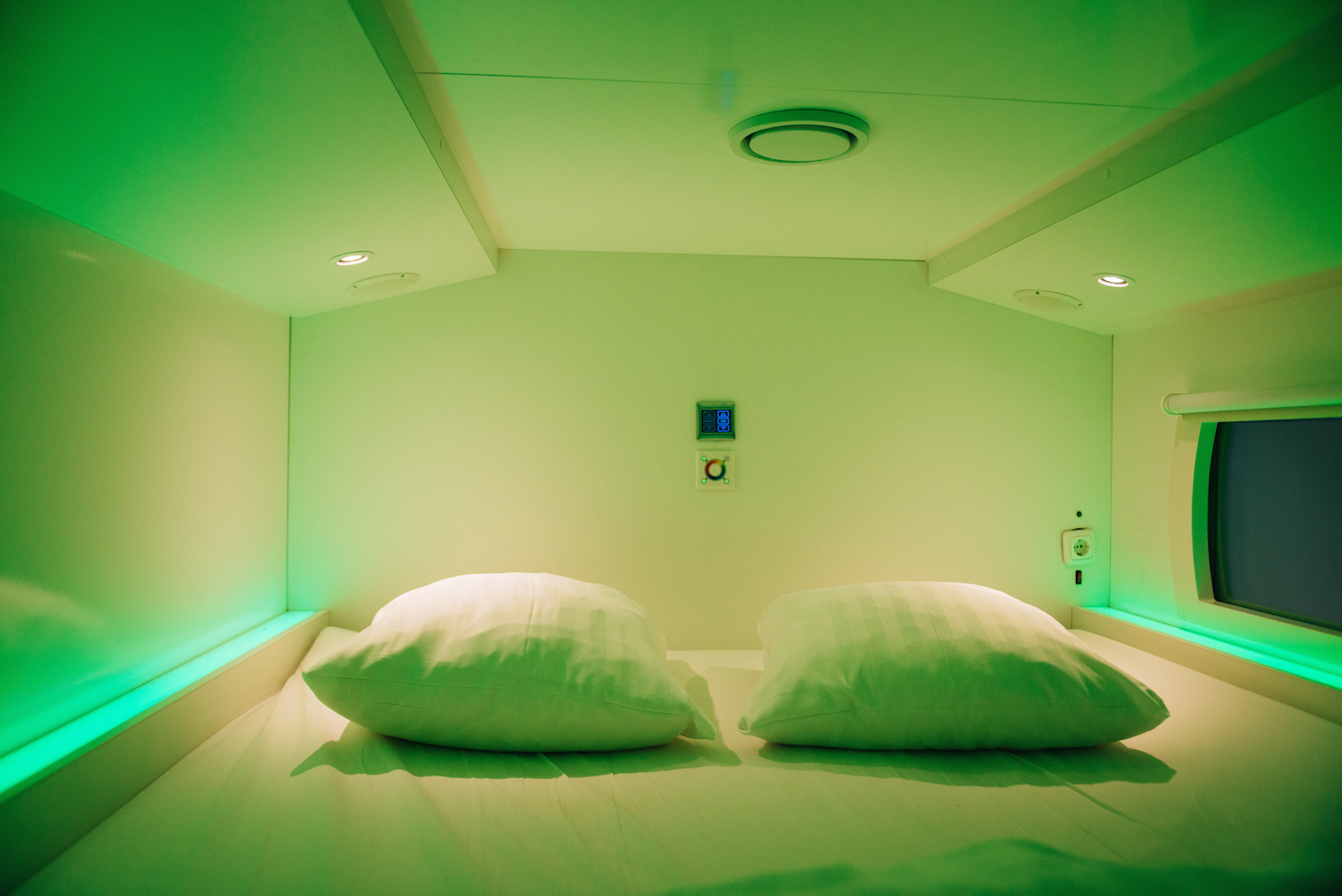 В каждом хабе есть двуспальная кровать, многотональная подсветка, встроенный порт для айфонов и прочей техники. Владельцы решили, что организовать простую вайфай-точку — это слишком банально, и пошли дальше, создав в хабах свою маленькую социальную сеть. В этот момент нашей беседы мы с удивлением смотрим на владельцев. Социальную что? Зачем двум белым контейнерам социальная сеть?